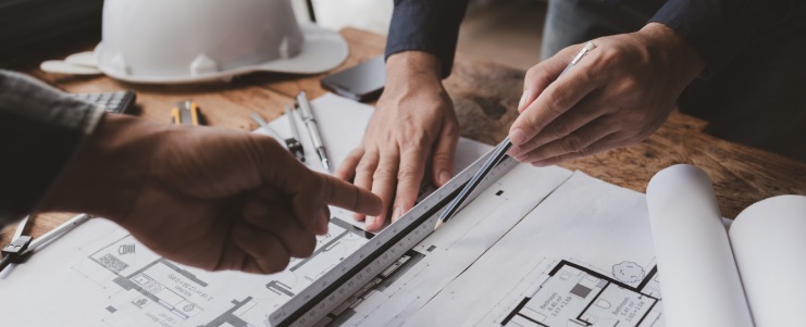 The home design architects are reviewing the house plan draft, the project commissioned by the client, and the custom design before delivery. Interior design and decoration ideas.