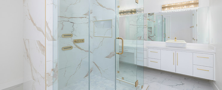 - Add warmth underfoot with heated floors, or opt for richly grained wood vanities that blend warmth and sophistication.
